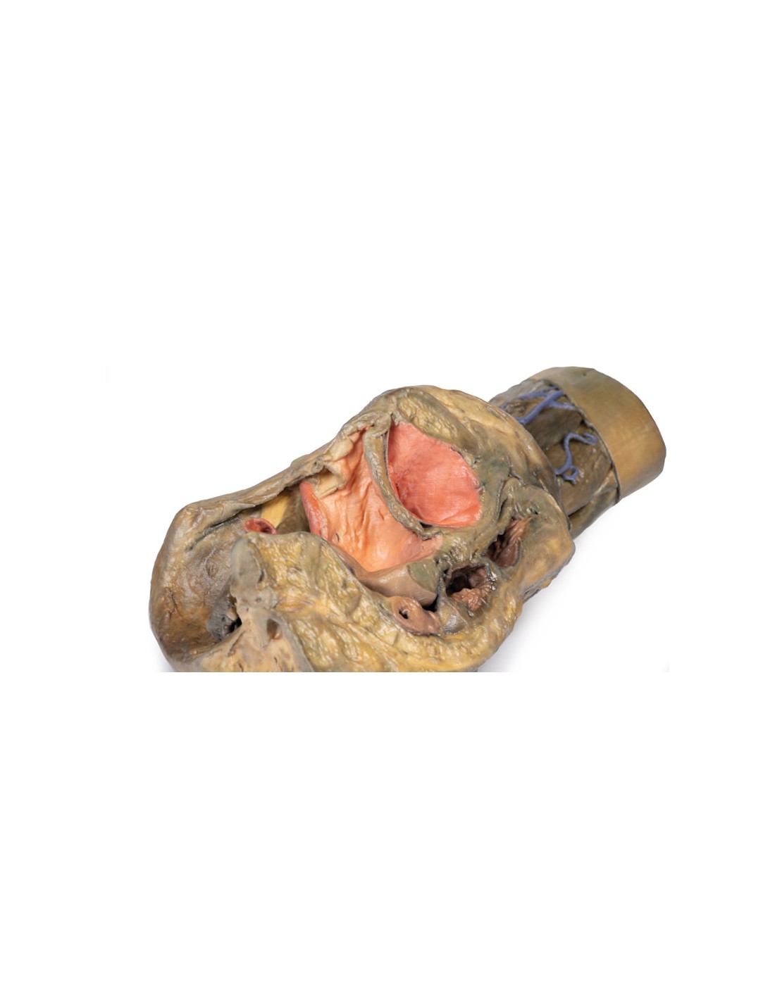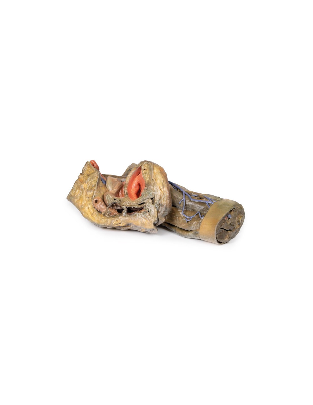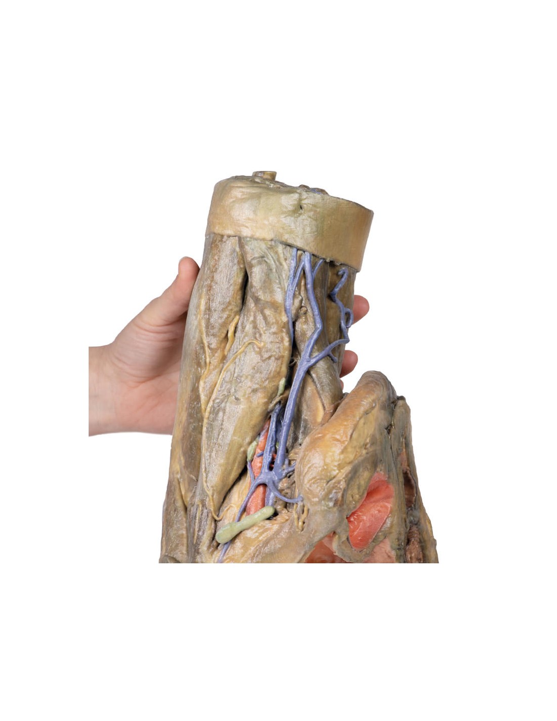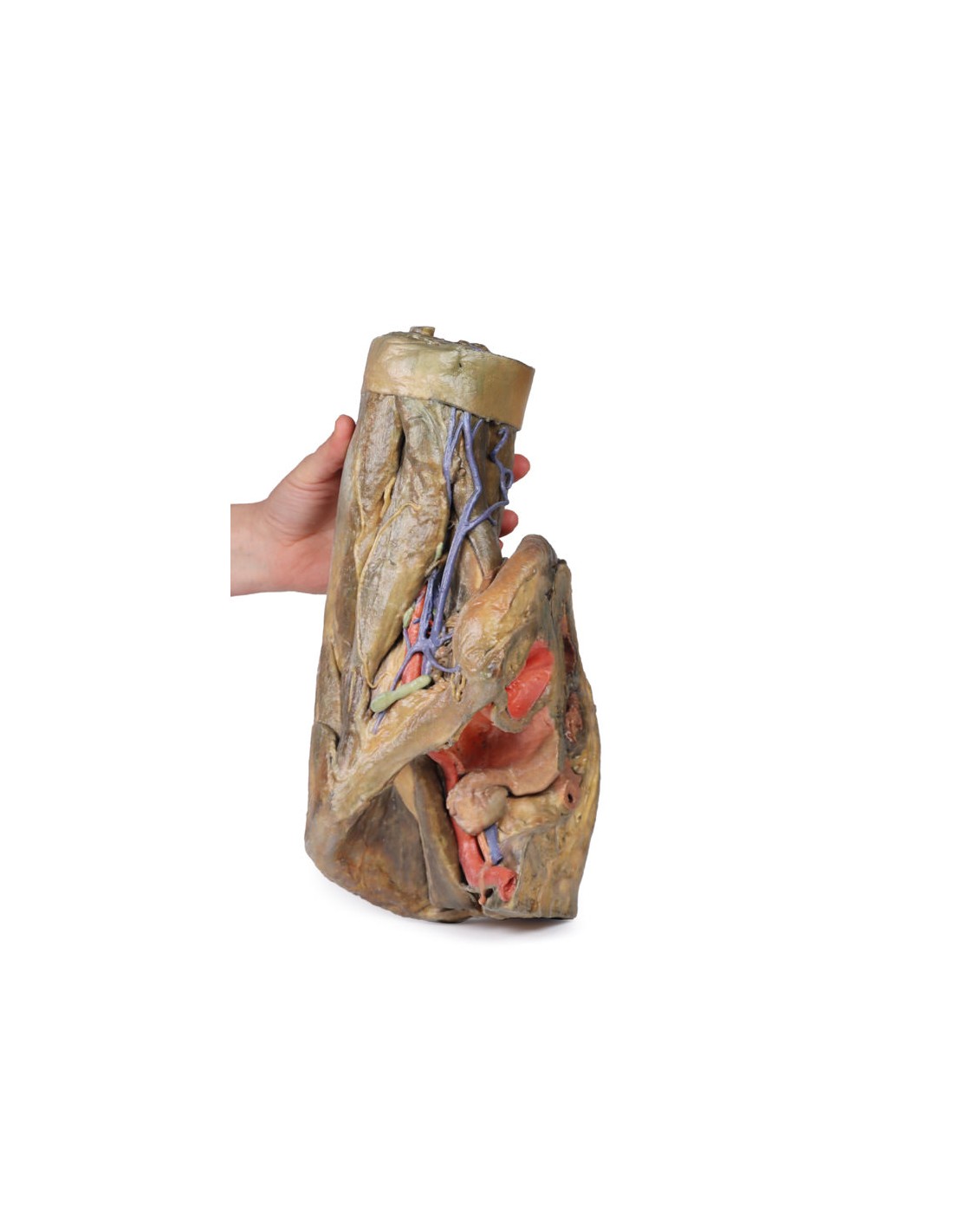 Die oberflächliche Faszie wurde über den gesamten Oberschenkel bis zum seitlichen Rand des Dammes und in der Nähe des unteren Teils des Modells selbst entfernt. Anterior wurde die Region des Femurdreiecks präpariert, um den Inhalt sowie die horizontale Gruppe der Leistenlymphknoten unmittelbar unterhalb des Leistenbandes freizulegen. Medial wird die Vena femoralis durch die Vena saphena magna und regionale Venen (einschließlich der Vena circumflexa iliaca, der Vena pudendalis superficialis externa und der Vena pudendalis deepa) drainiert. Unmittelbar seitlich der Vene ist die Arteria femoralis zu sehen, wobei Teile des Nervus femoralis unmittelbar seitlich der Arterie und nahe der Sehne des Musculus iliopsoas absteigen. Obwohl durch die Dissektion etwas gestört,