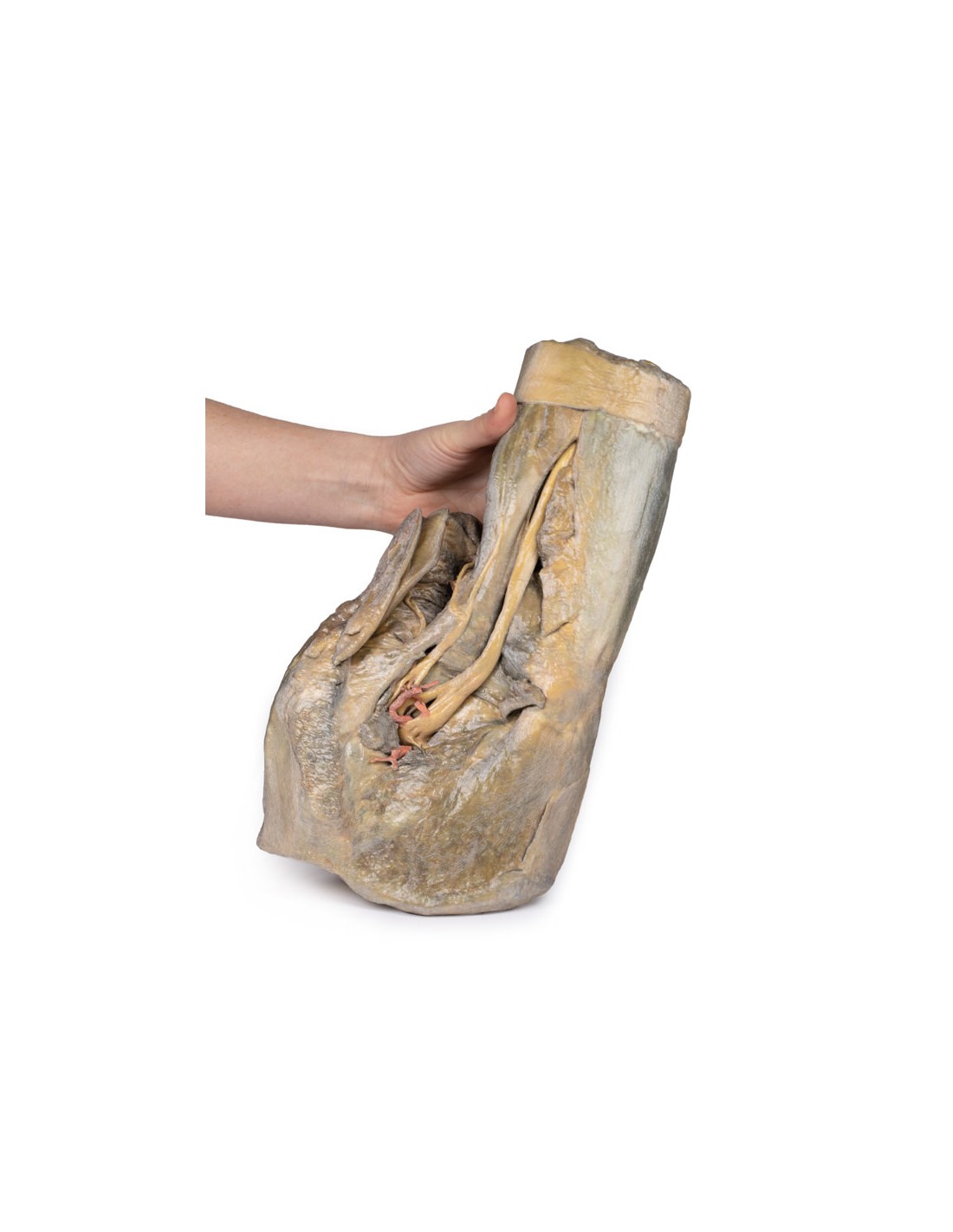 Im hinteren Bereich wurde die Gesäßregion mit der Entfernung des M. gluteus maximus seziert, um die darunter liegenden Gesäßmuskeln freizulegen, wobei der Reflex des M. piriformis die neurovaskulären Strukturen in der Region erkennen lässt. Man erkennt den Ischiasnerv, der sich durch Beiträge des N. tibialis und des N. peroneus um die erhaltenen Anteile der Arteria glutealis superior und inferior bildet. Medial verläuft der N. cutaneus posterior des Oberschenkels parallel zum N. ischiadicus, wobei beide Muskeln auf der inneren Obturatorsehne und den Zwillingsmuskeln aufliegen, bevor sie oberhalb des Quadratus femoris bzw. des gemeinsamen Ursprungs des Hamstrings in den Oberschenkel absteigen. Tief unten am Ligamentum sacrotuberosum kann man dem Verlauf der Arteria pudendalis interna und des Nervus pudendalis in Richtung der Fossa ischioanalis folgen,