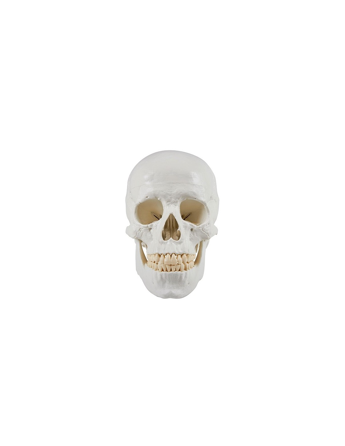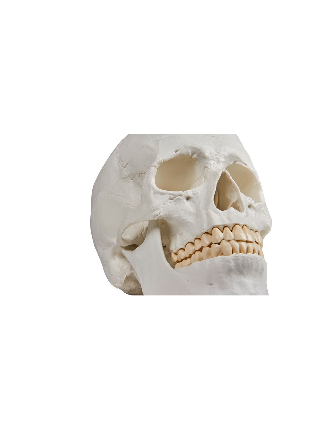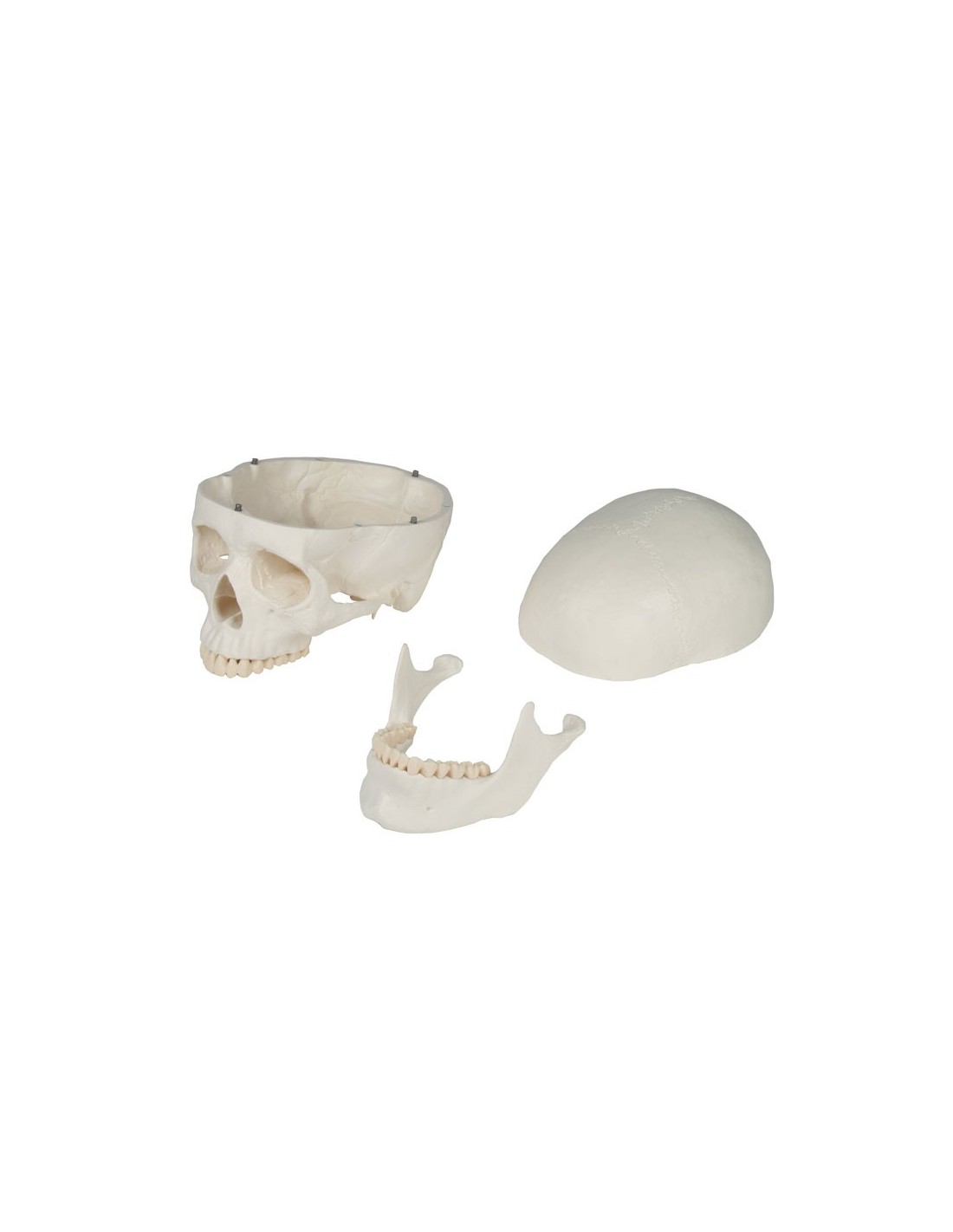 Das pädagogische Schädelmodell ist in drei Teile zerlegbar und besteht aus Schädelbasis, Schädeldecke und Unterkiefer. Die Zähne entsprechen den echten Zähnen. Der Unterkiefer ist beweglich und kann abgenommen werden.
