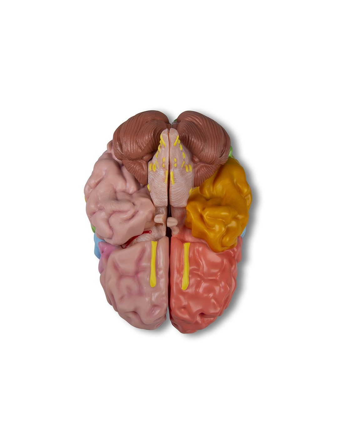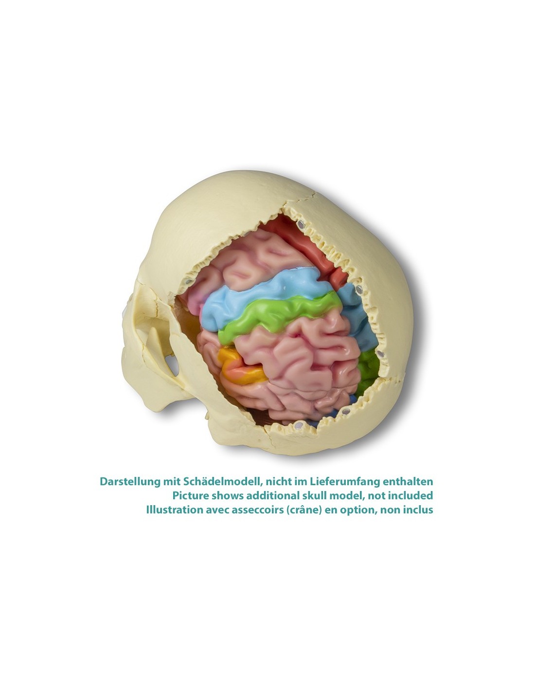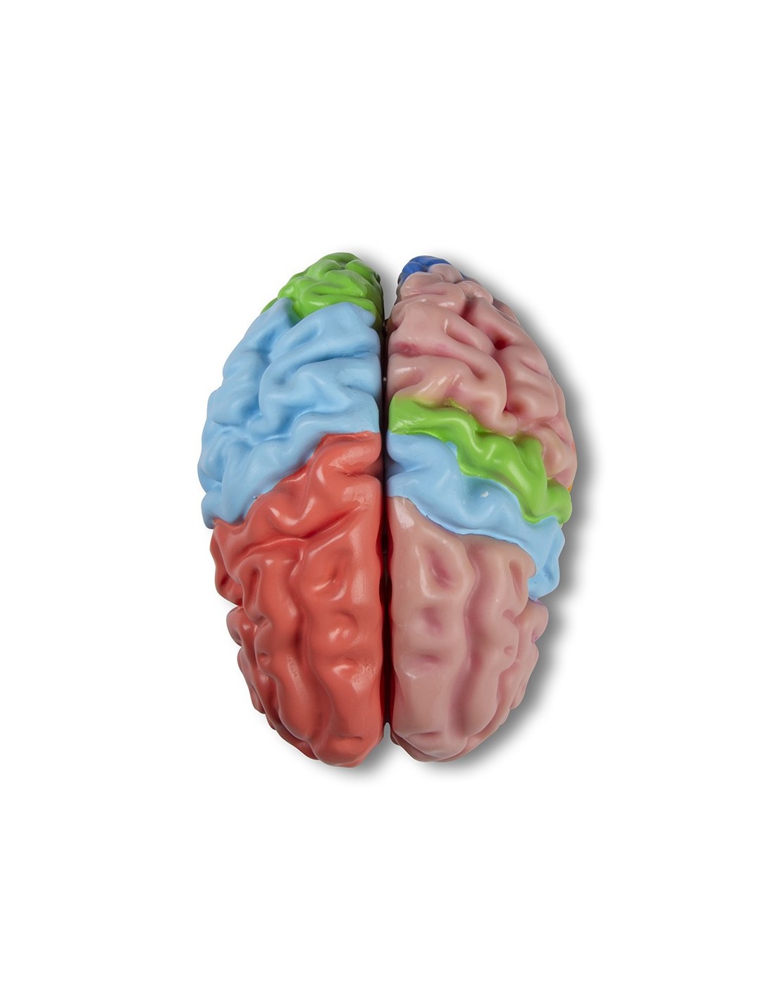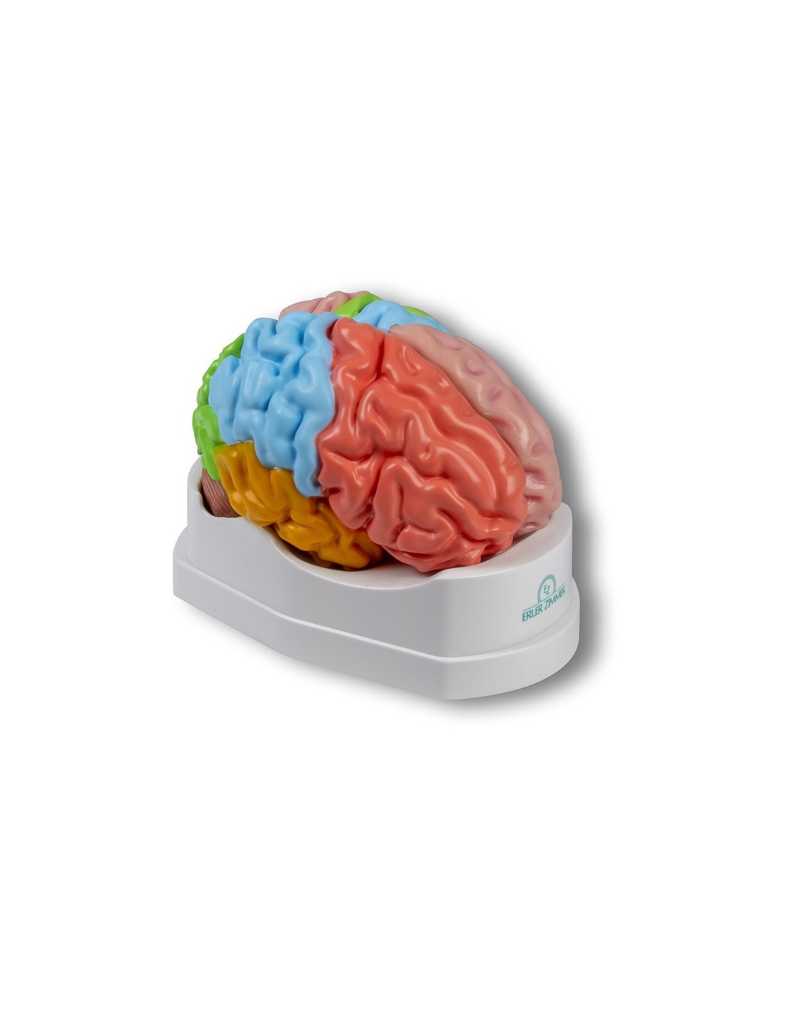 This life-size brain model shows the main anatomical landmarks and cortical areas of the brain in accurately painted colors. The right half is painted to show the four lobes of the brain: parietal, temporal, occipital and frontal.