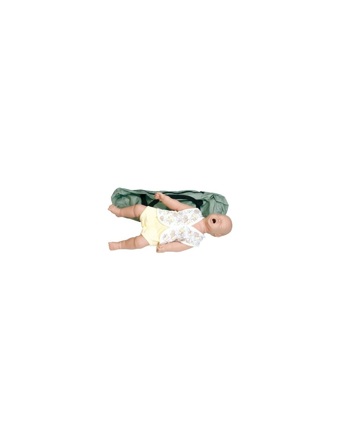 This medical first aid simulator is a life-size infant manikin that allows for practice of abdominal and chest thrusts, the Heimlich maneuver, and mouth inspection to clear an airway obstruction.
