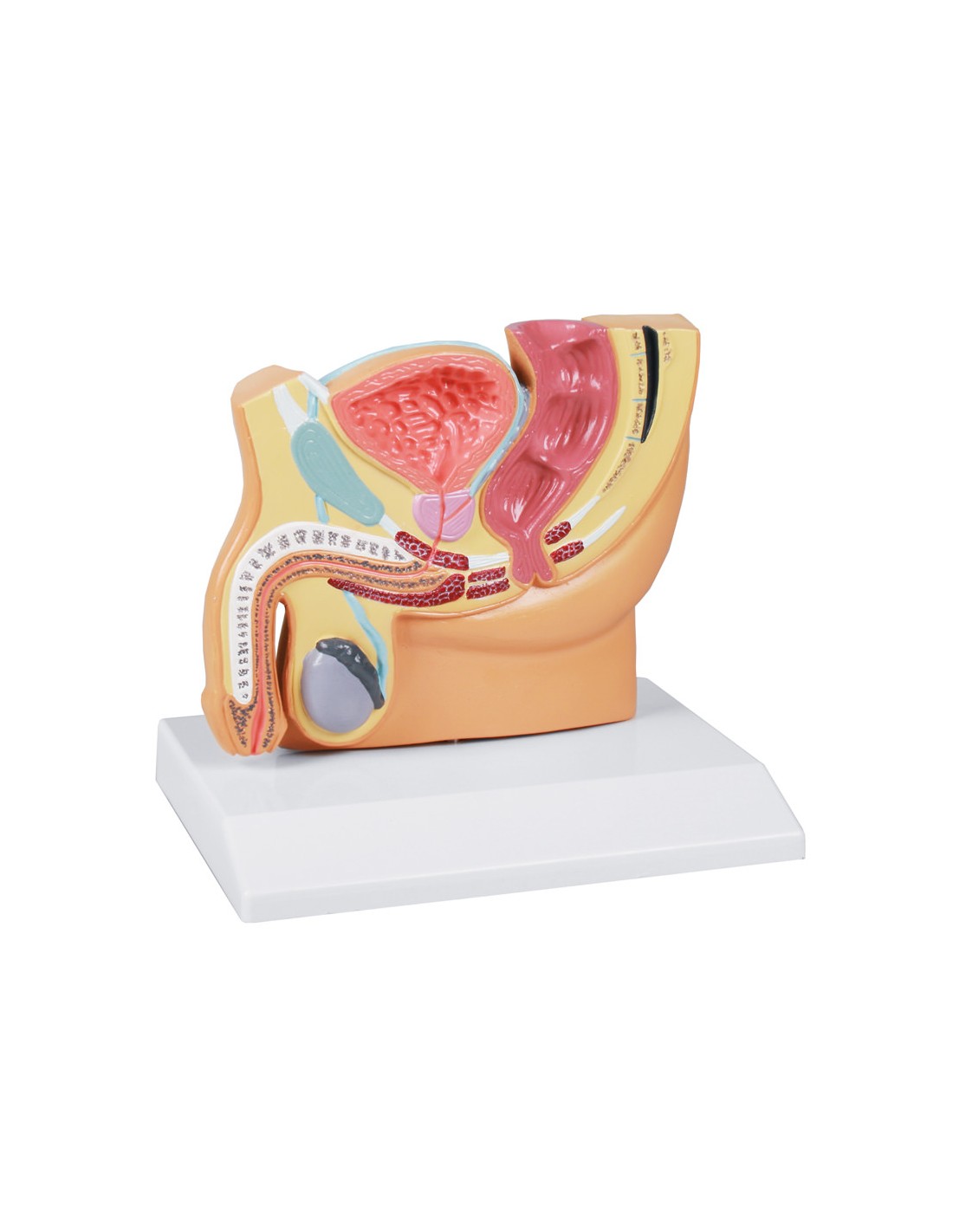 The model shows the male genitalia, bladder with ureters, prostate, and anus.