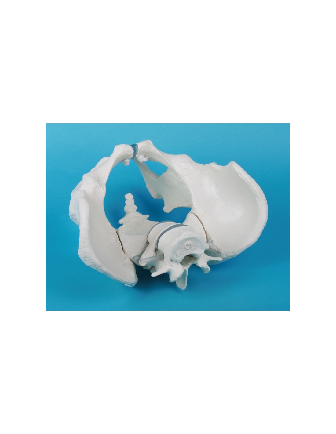 The model was made from a natural cast of the pelvis of an adult European male, and shows the skeleton of the iliac bones, sacrum, and two elastically mounted lumbar vertebrae.