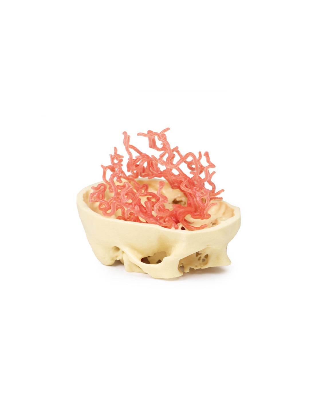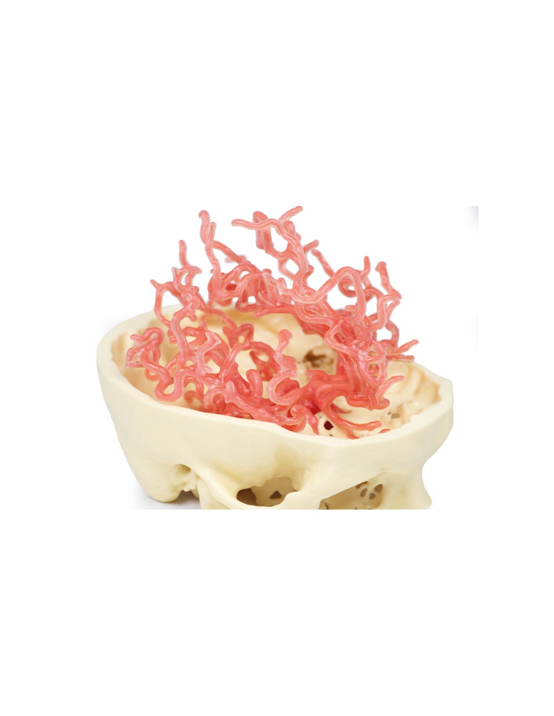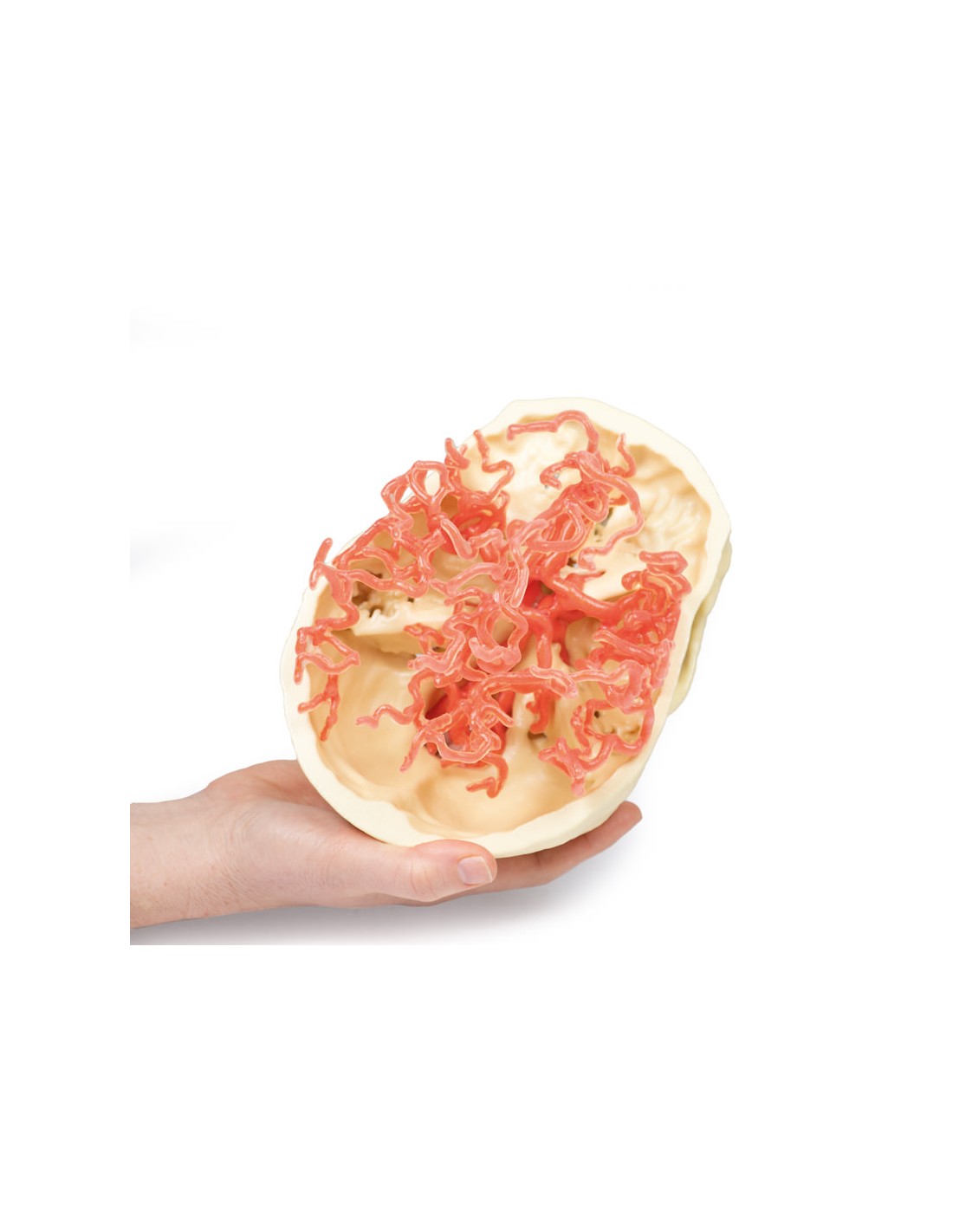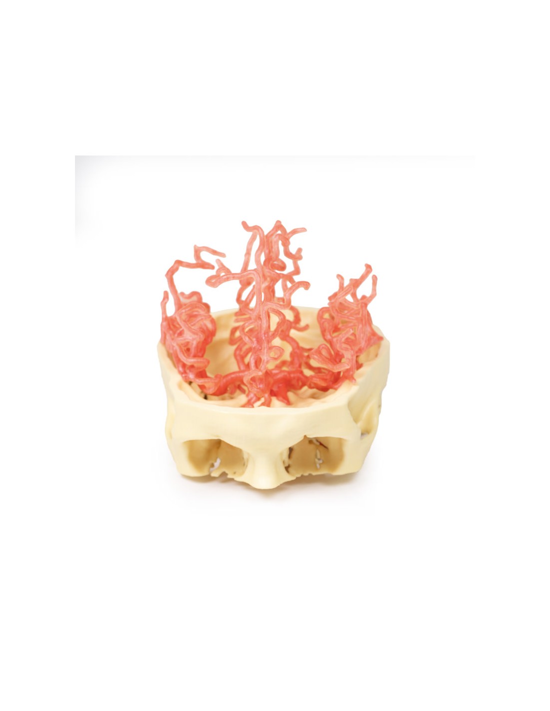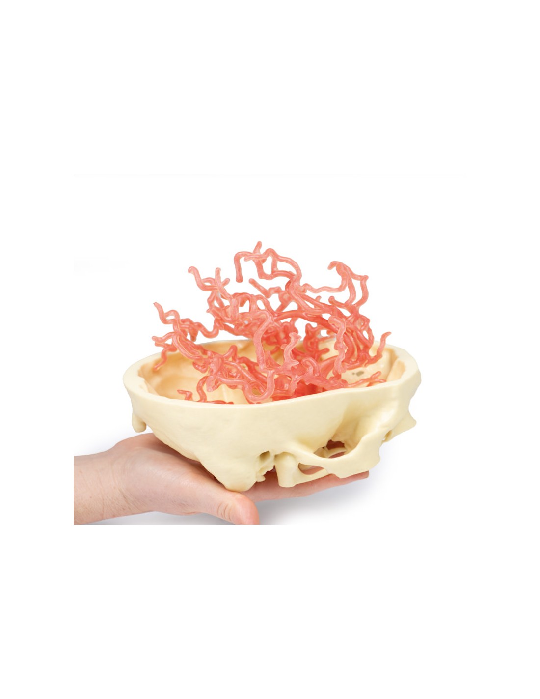 Esta impresión 3D presenta una versión ampliada del mismo conjunto de datos que subyace a nuestra impresión 3D del Círculo de Willis, derivado de una cuidadosa segmentación de los datos angiográficos. Al igual que nuestra impresión del Círculo de Willis, este modelo muestra las arterias carótida interna y vertebral entrando en el cráneo y ramificándose en las arterias intracraneales que irrigan el cerebro. Esta impresión 3D más ampliada de la carótida interna y la arteria vertebral y sus ramas, incluido el Círculo de Willis, muestra el modelo completo de ramificación de las arterias cerebrales y cerebelosas. Esto incluye las arterias pericallosas (del cerebro anterior) con sus ramas nombradas, las divisiones superior e inferior del cerebro medio (incluidas las arterias sulcal, temporal y parietal) y las ramas de la arteria cerebral posterior.