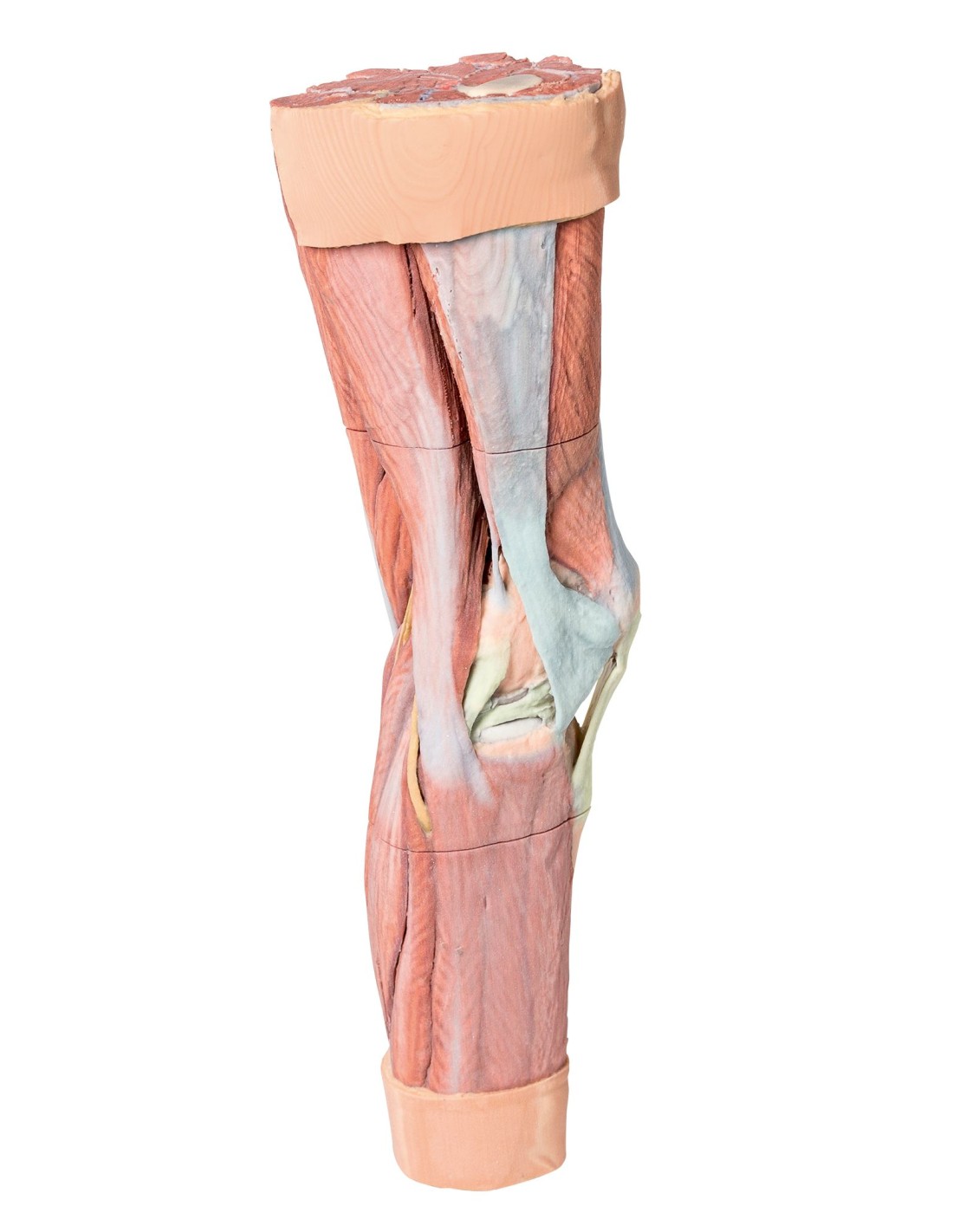 Este modelo de disección de la musculatura de la extremidad inferior impreso en 3D muestra una disección superficial de la musculatura de la extremidad inferior desde la mitad del muslo hasta la mitad de la pierna, así como los nervios y vasos de la fosa poplítea.