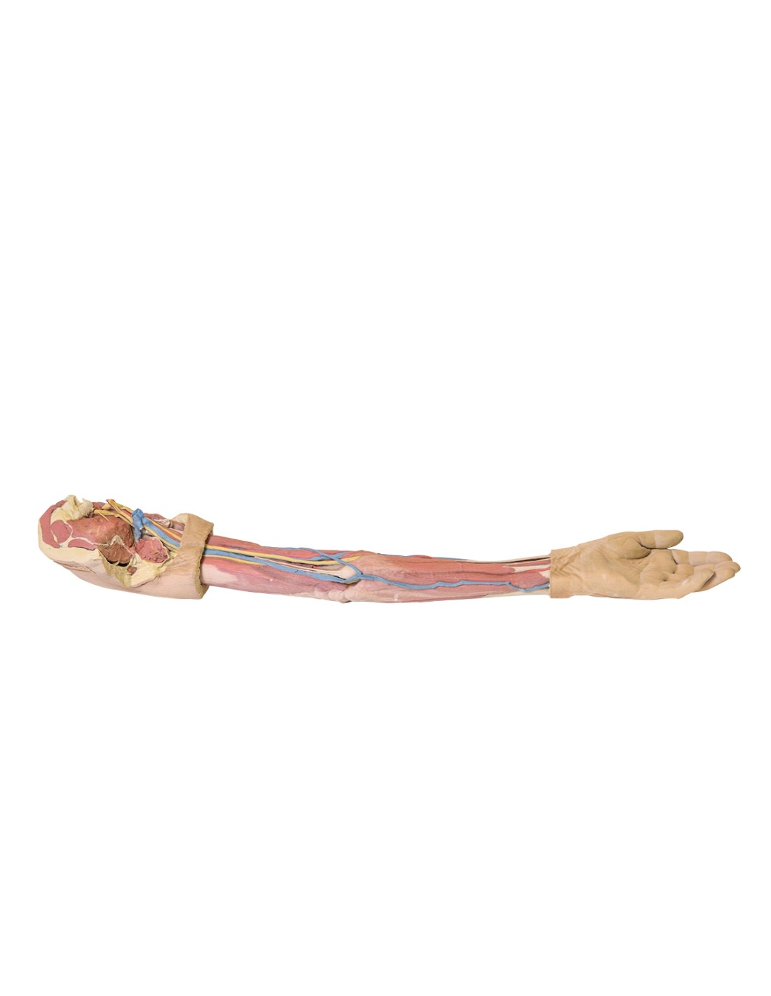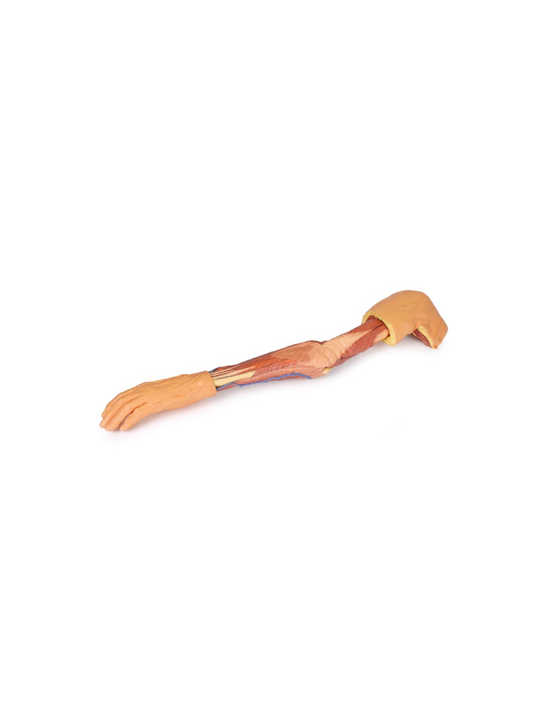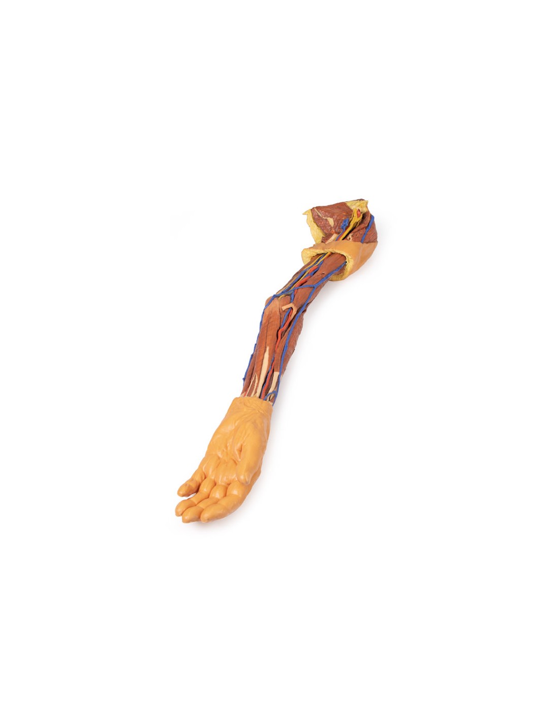 Este espécimen impreso en 3D muestra la anatomía superficial de un miembro superior izquierdo desde la lámina de la escápula hasta la mano.