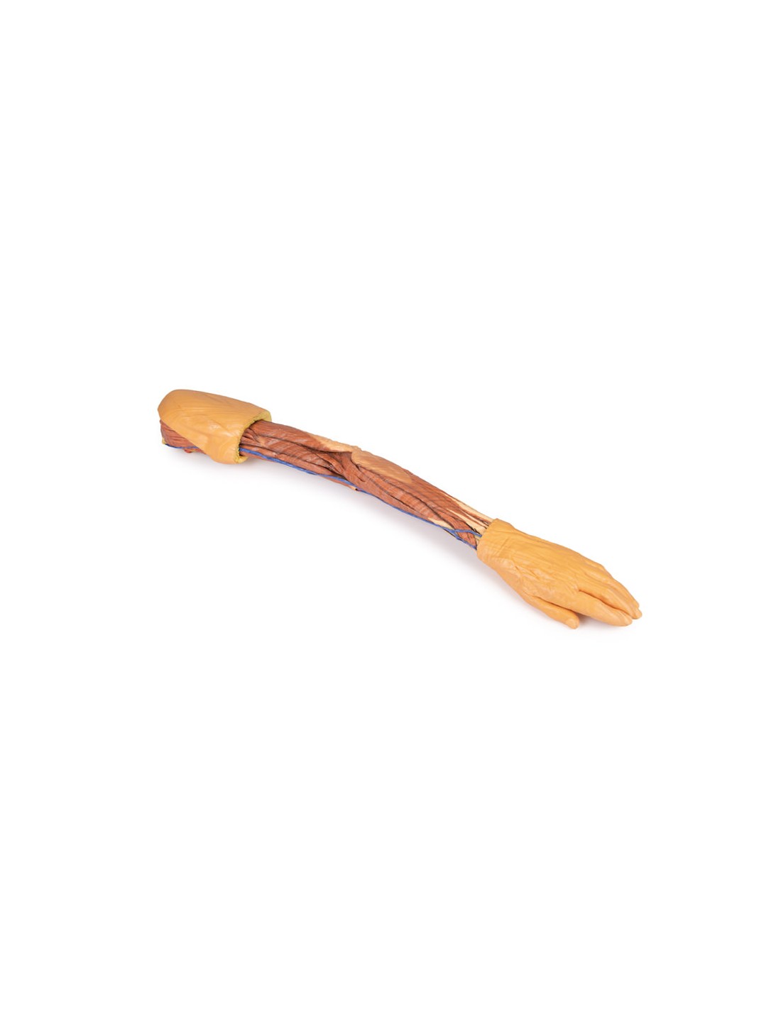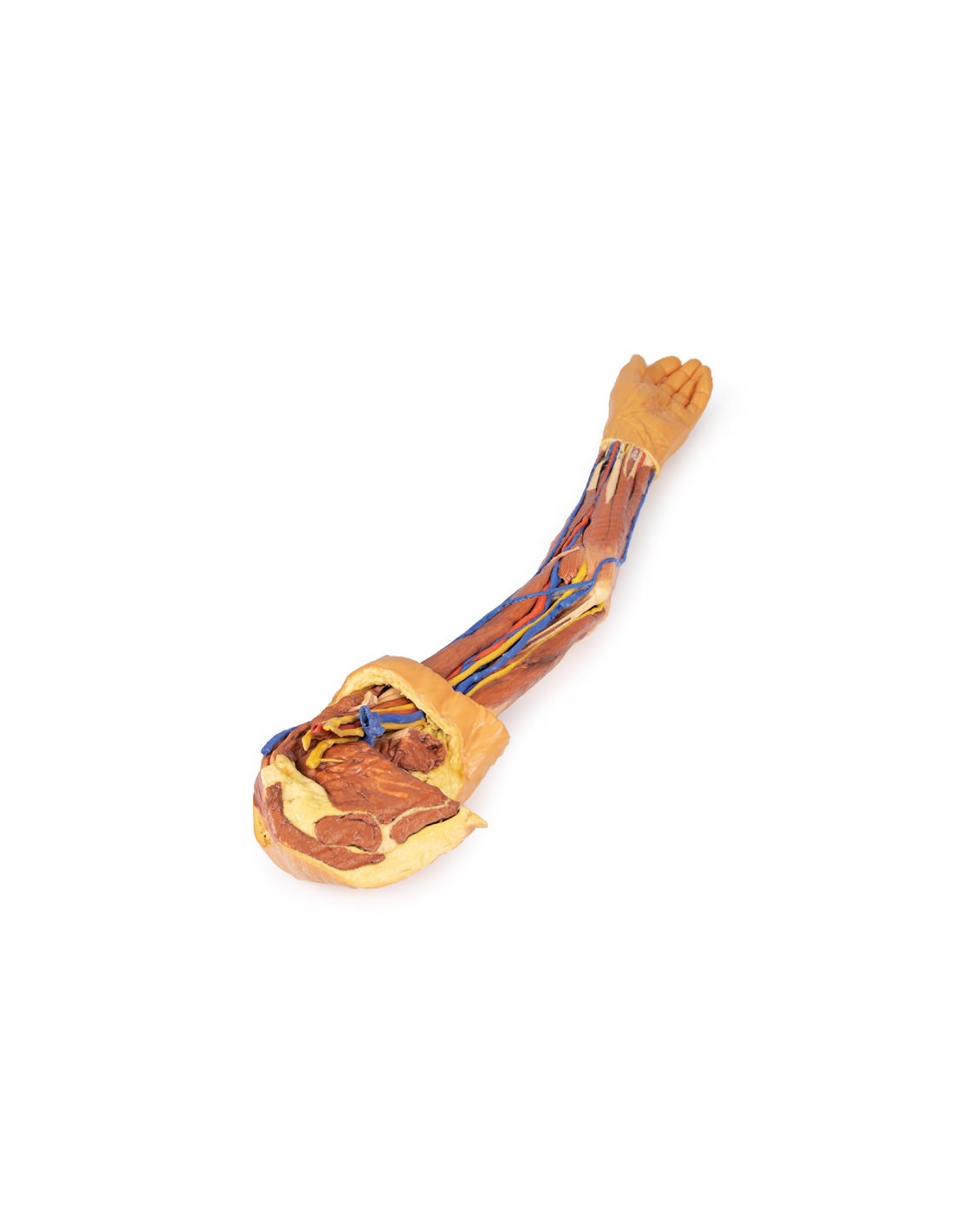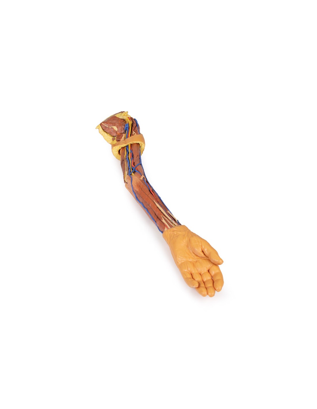Este espécimen impreso en 3D muestra la anatomía superficial de un miembro superior izquierdo desde la lámina de la escápula hasta la mano.