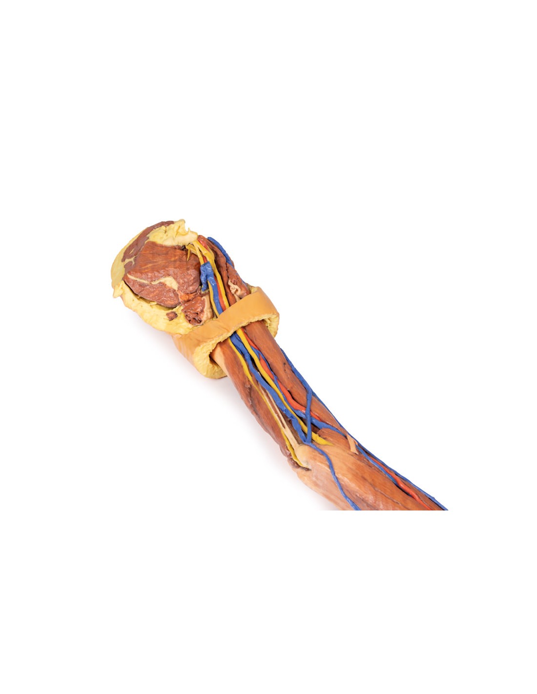 Se han eliminado la piel y la fascia superficial y profunda de la mayor parte de la extremidad, excepto en el dorso de la escápula, la parte proximal del brazo y la mano.