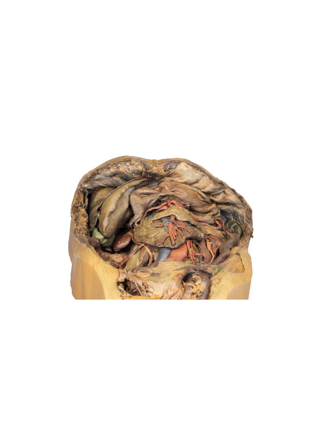 El bazo está situado en el hipocondrio izquierdo del espécimen. Su huella gástrica indica el lugar donde normalmente se encontraría la mayor curvatura del estómago.
