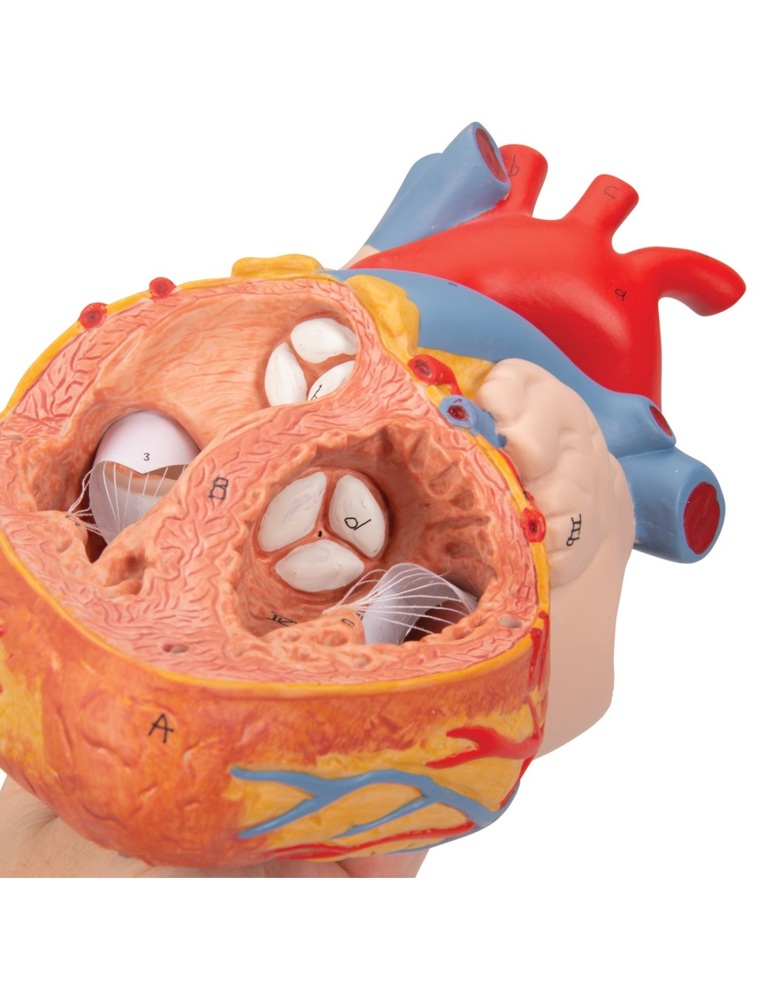 Este modelo de corazón dos veces ampliado facilita la identificación de las estructuras y es una ayuda perfecta en las grandes aulas escolares o universitarias. La anatomía del corazón humano con ventrículos, aurículas, venas, arterias y aorta se ilustra con gran detalle.