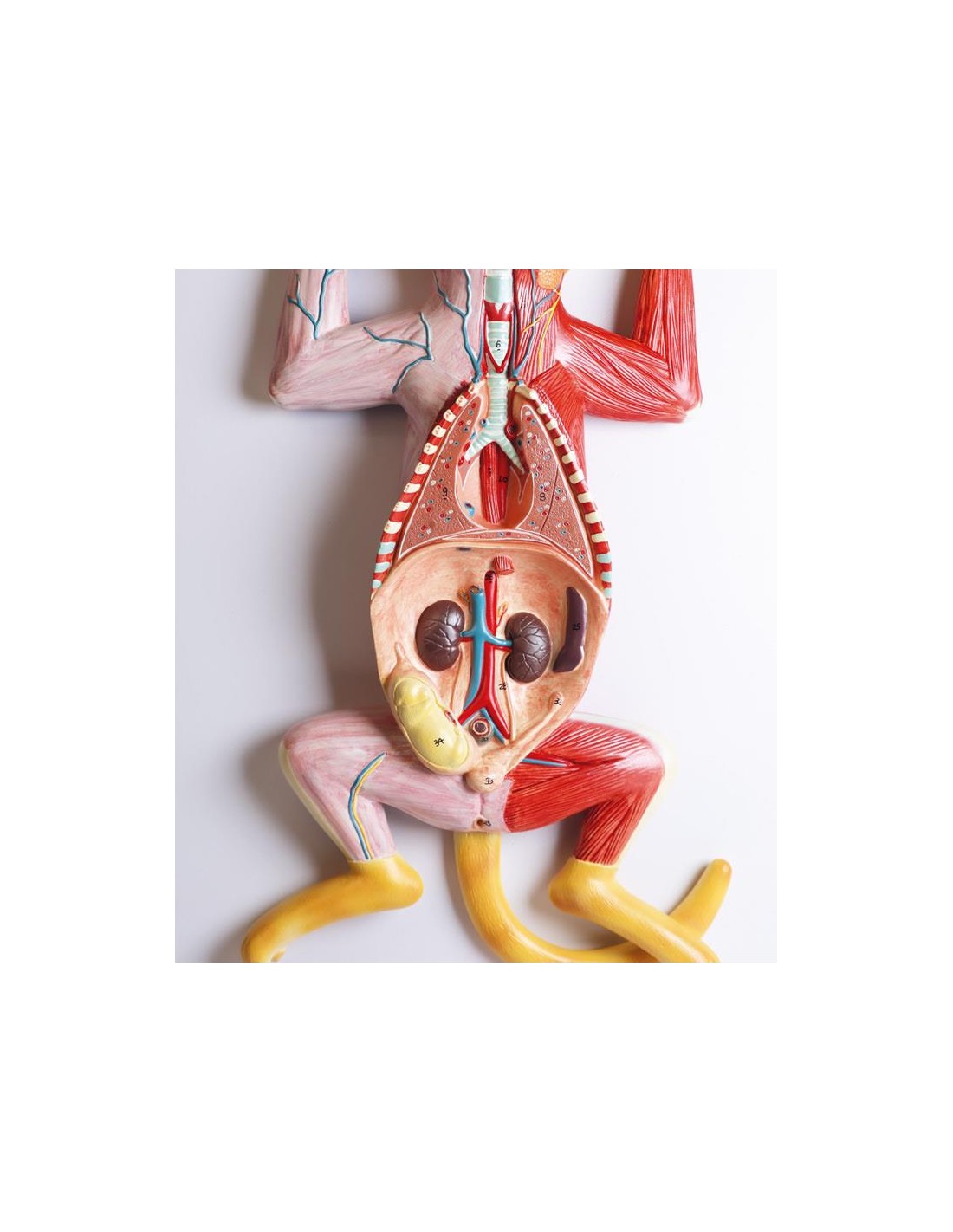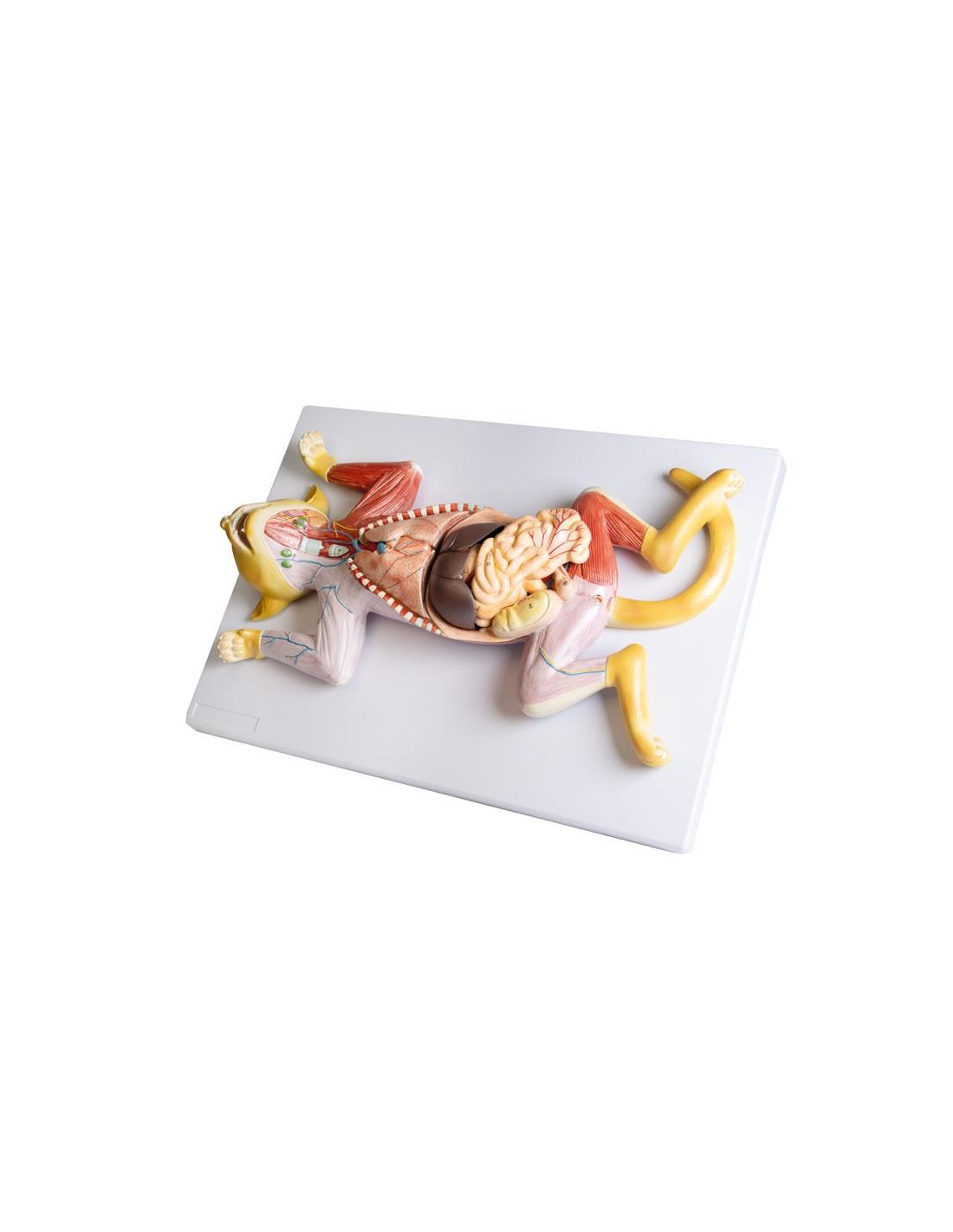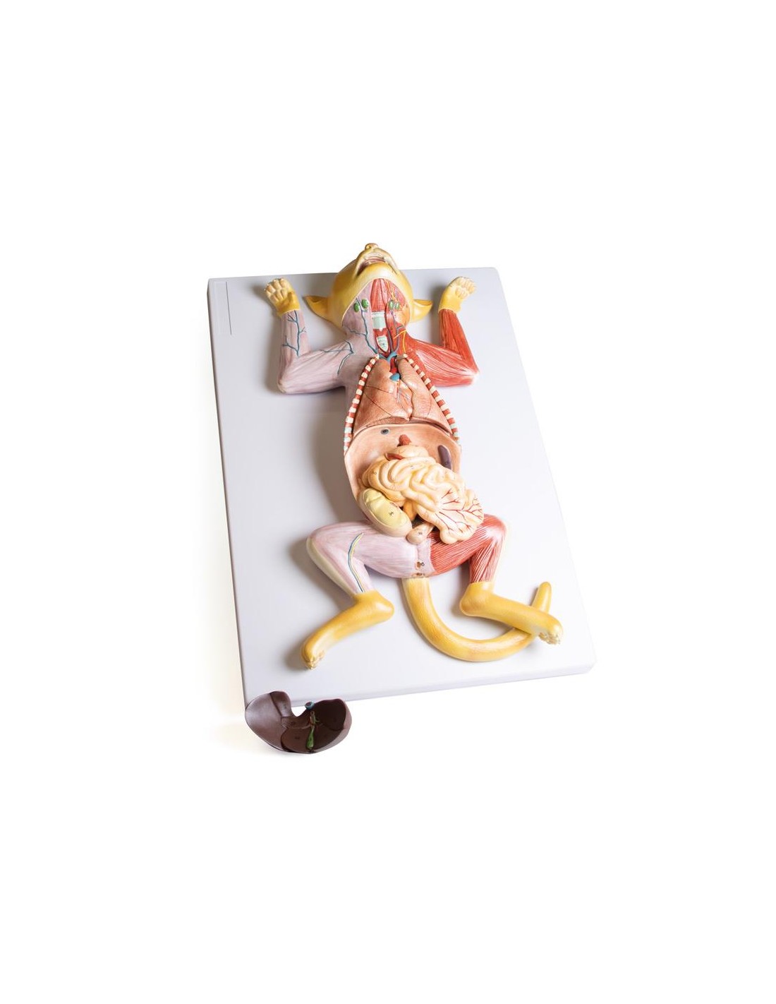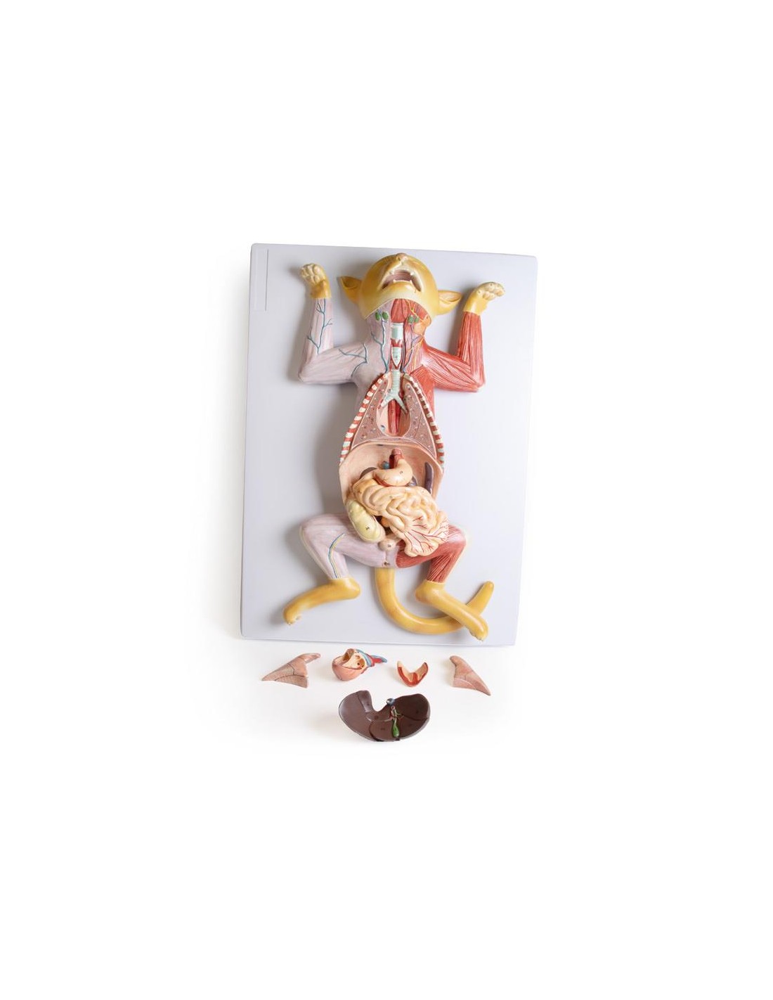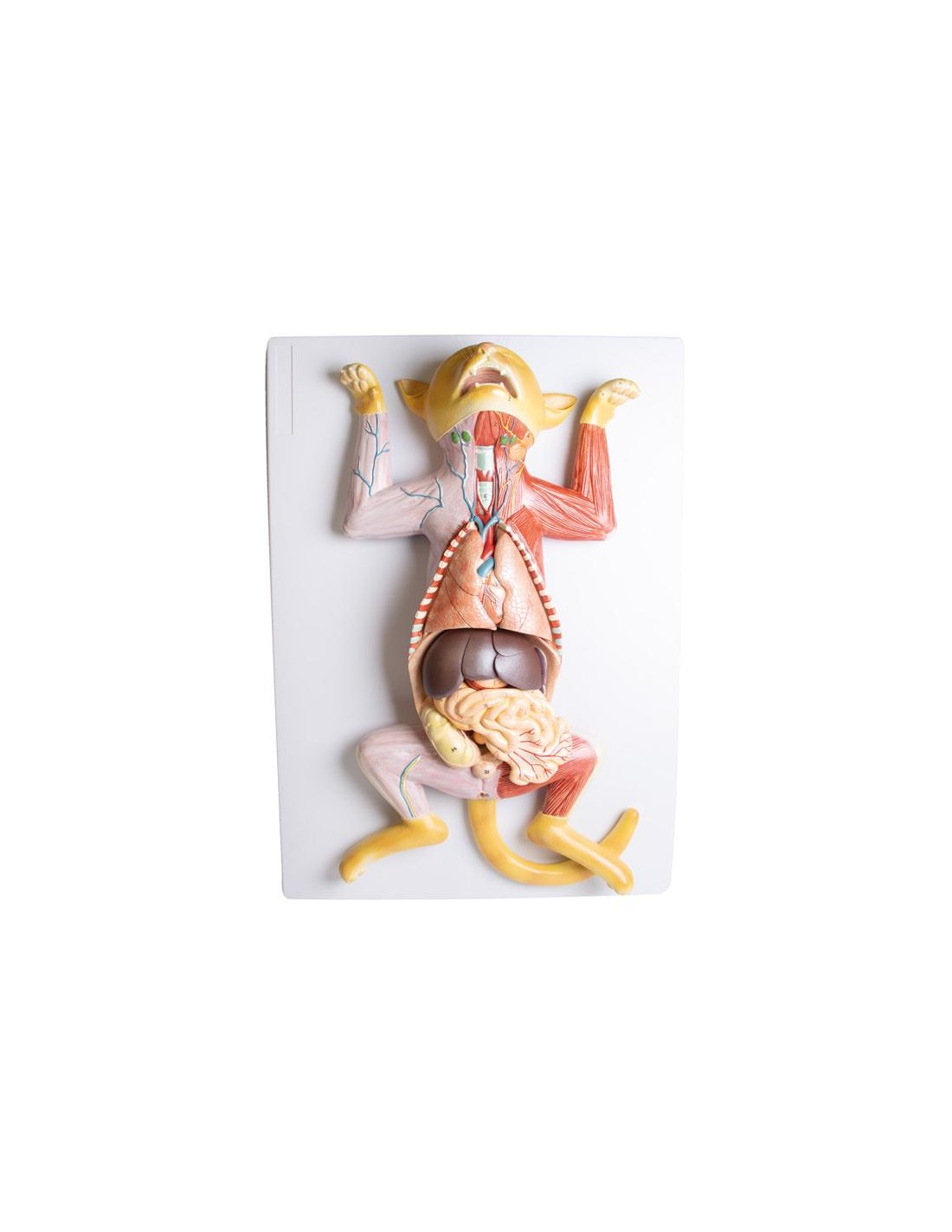 Excelente complemento para la disección práctica, este modelo de gata despellejada ofrece una fácil visualización de la musculatura superficial.