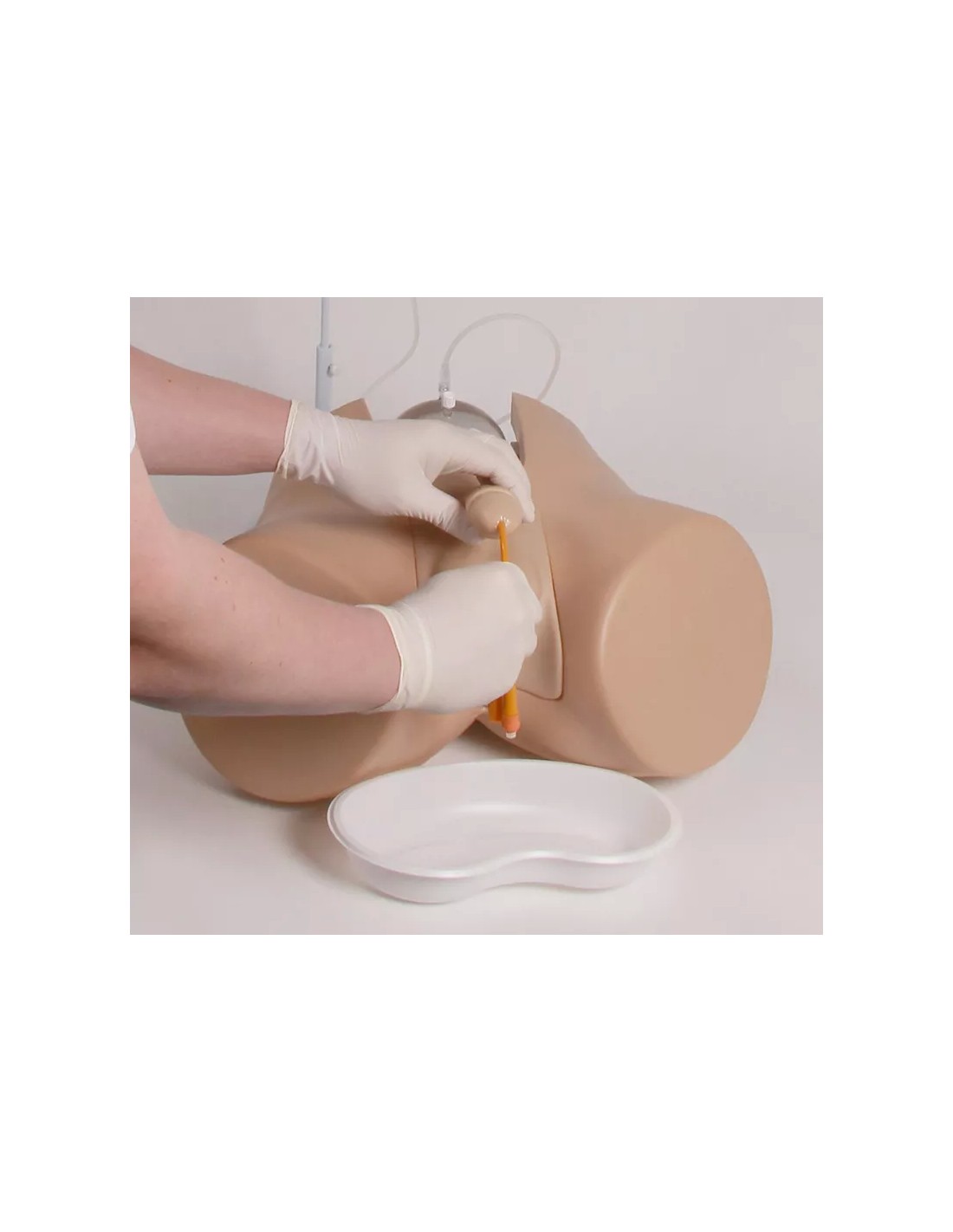 Los genitales masculinos están equipados con un prepucio intercambiable que, al igual que el humano, es móvil, lo que permite practicar la manipulación y la higiene. Este modelo cuenta con la uretra más realista de cualquier simulador de cateterismo actualmente en el mercado. Las cuatro secciones de la uretra están representadas con su forma anatómica correspondiente y una resistencia realista durante el cateterismo. Al colocar una banda, es posible simular el estrechamiento de la próstata debido a la hiperplasia prostática benigna (HPB) o al cáncer de próstata, lo que permite practicar el uso de un catéter más grande o más rígido.