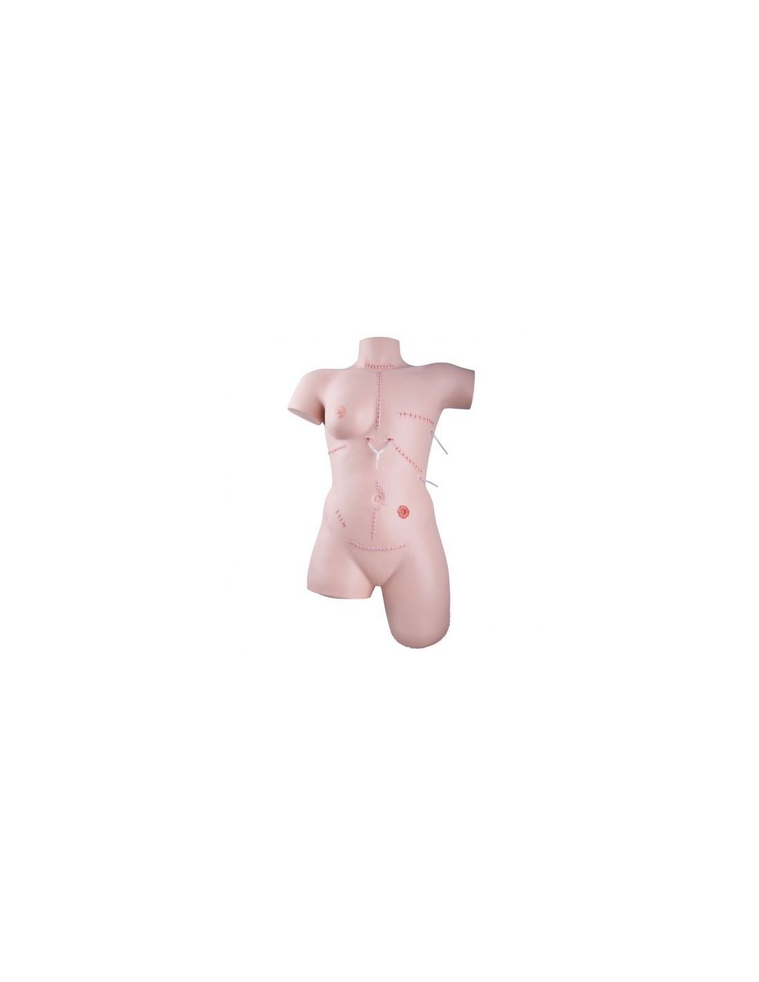 En el torso del simulador para el cuidado de heridas y técnicas de vendaje se representan de forma realista las siguientes heridas y sistemas de drenaje de procedimientos quirúrgicos
