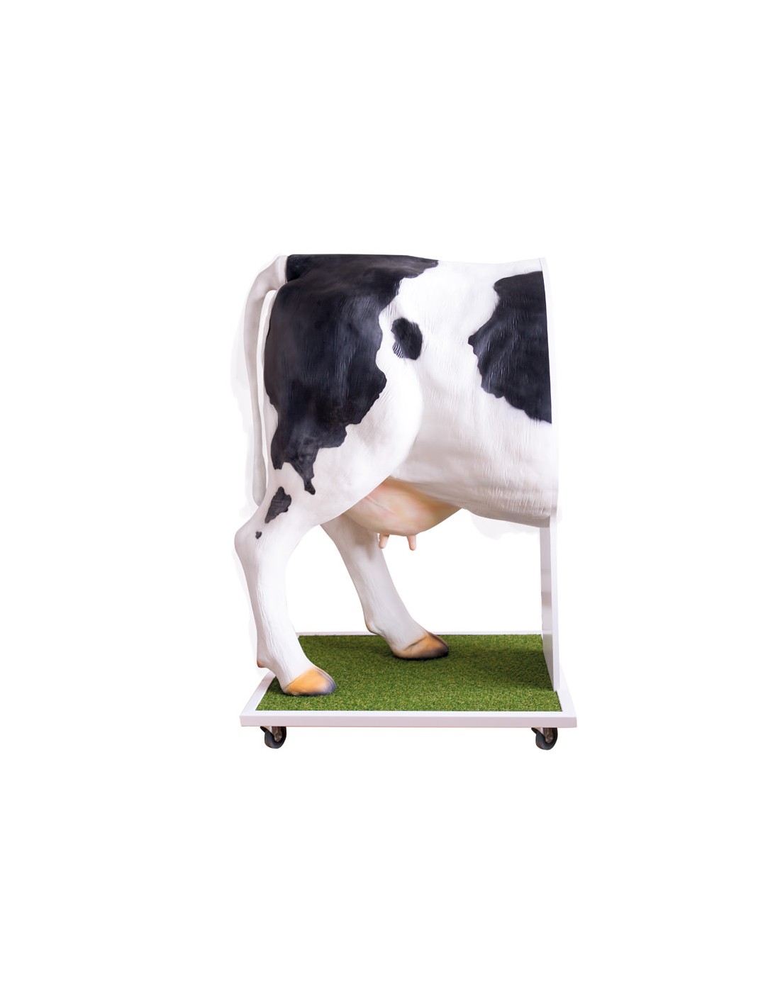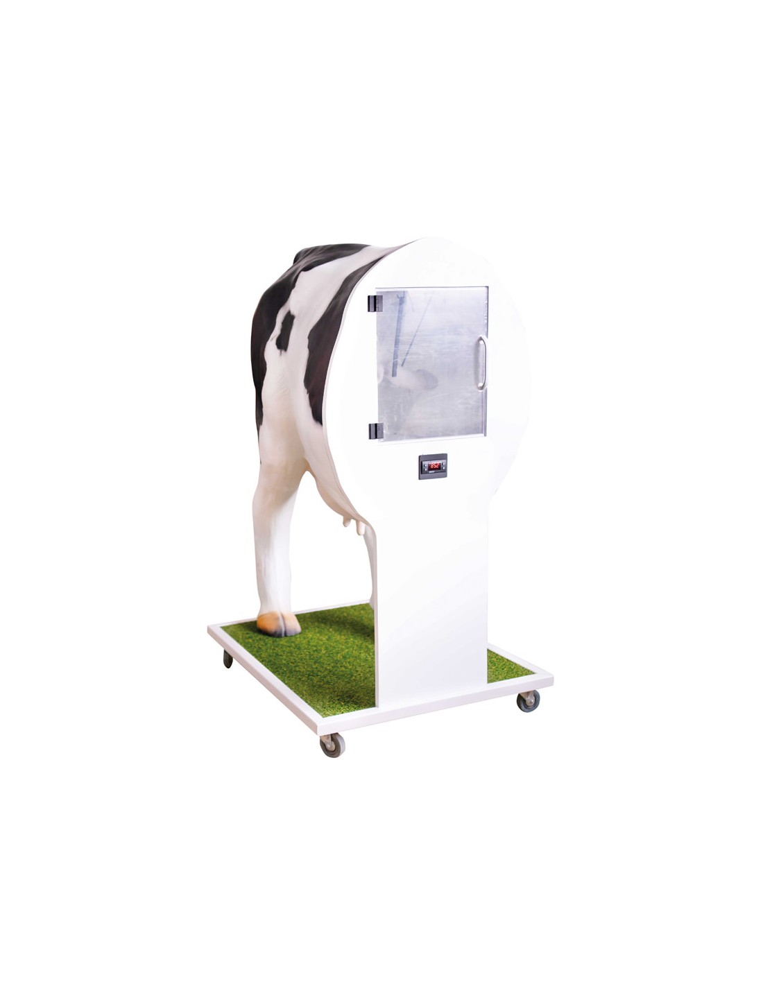 El simulador representa la mitad trasera de una vaca reproductora sobre una base con ruedas. Permite el entrenamiento y la observación de la manipulación de palpación realizada durante el proceso de inseminación y el examen por recto.