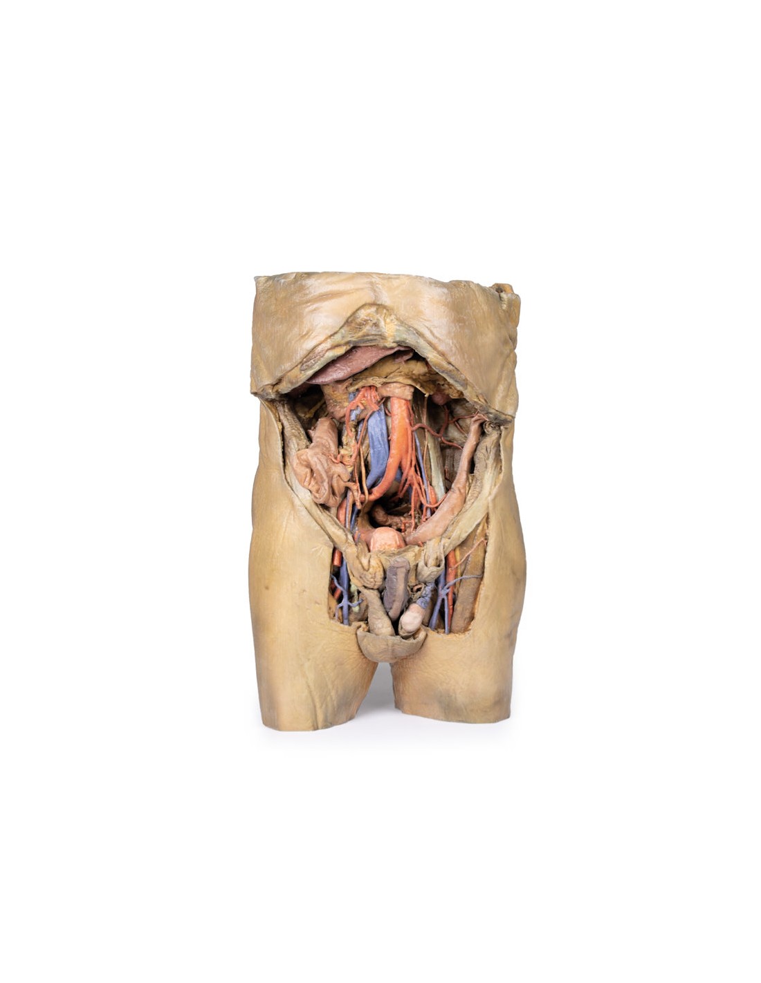 Ce modèle 3D est l'un des plus grands et des plus complexes de la série. Il consiste en un torse partiel allant du diaphragme à la cuisse proximale, avec une cavité abdominale complète préservant plusieurs niveaux de dissection. Ce modèle 3D enregistre également la rare occurrence simultanée de hernies inguinales directes et indirectes, ce qui permet d'examiner la base anatomique de ces deux conditions. Compte tenu de l'ampleur de la dissection, la description de ce modèle 3D est divisée en parties distinctes basées sur les vues et les régions.