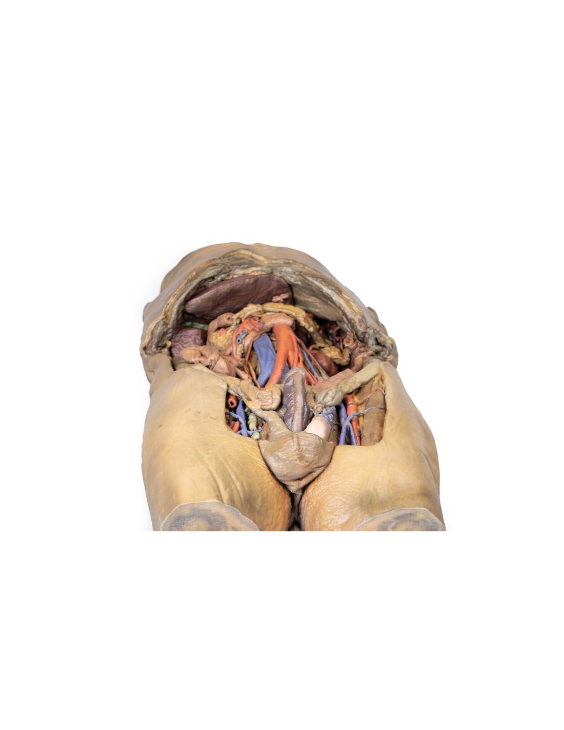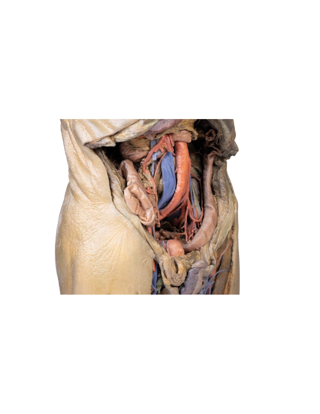 À l'intérieur de l'abdomen, la paroi abdominale antérieure, le grand épiploon et une grande partie du tractus gastro-intestinal ont été enlevés, ainsi que le péritoine pariétal au-dessus de la paroi abdominale postérieure, afin d'exposer les organes et les structures rétropéritonéales. Dans la partie supérieure de l'abdomen, la partie terminale de l'œsophage a été conservée et on peut la voir pénétrer dans la cavité juste à côté du lobe gauche du foie. L'ablation de l'estomac a permis d'exposer l'extension du pancréas depuis la tête (située dans la voûte du duodénum) jusqu'à la queue qui s'étend jusqu'à la capsule de la rate conservée dans l'hypochondre gauche. Au-dessus du pancréas, on peut voir l'artère splénique et les artères hépatiques communes qui s'étendent à travers l'espace étroit entre le pancréas, le diaphragme et le foie. L'artère splénique suit l'archétype du "chemin détourné" vers la rate et se divise nettement avant d'atteindre le hile (et à côté de la veine splénique). L'artère hépatique commune se divise en artère gastroduodénale (visible comme un vaisseau coupé juste en dessous du duodénum) et en artère gastrique droite ; ces vaisseaux sont superficiels par rapport à la veine porte hépatique. On peut voir l'artère et la veine mésentériques supérieures passer en avant près de la tête du pancréas et de la partie horizontale du duodénum, et l'artère iléo-colique conservée peut être retracée jusqu'au cæcum du gros intestin dans le quadrant inférieur droit de l'abdomen. La veine mésentérique inférieure peut, en partie, être appréciée ; elle provient de la veine rectale supérieure conservée qui monte du vrai bassin sans être sectionnée et s'étend à travers l'aspect superficiel de l'aorte thoracique descendante.