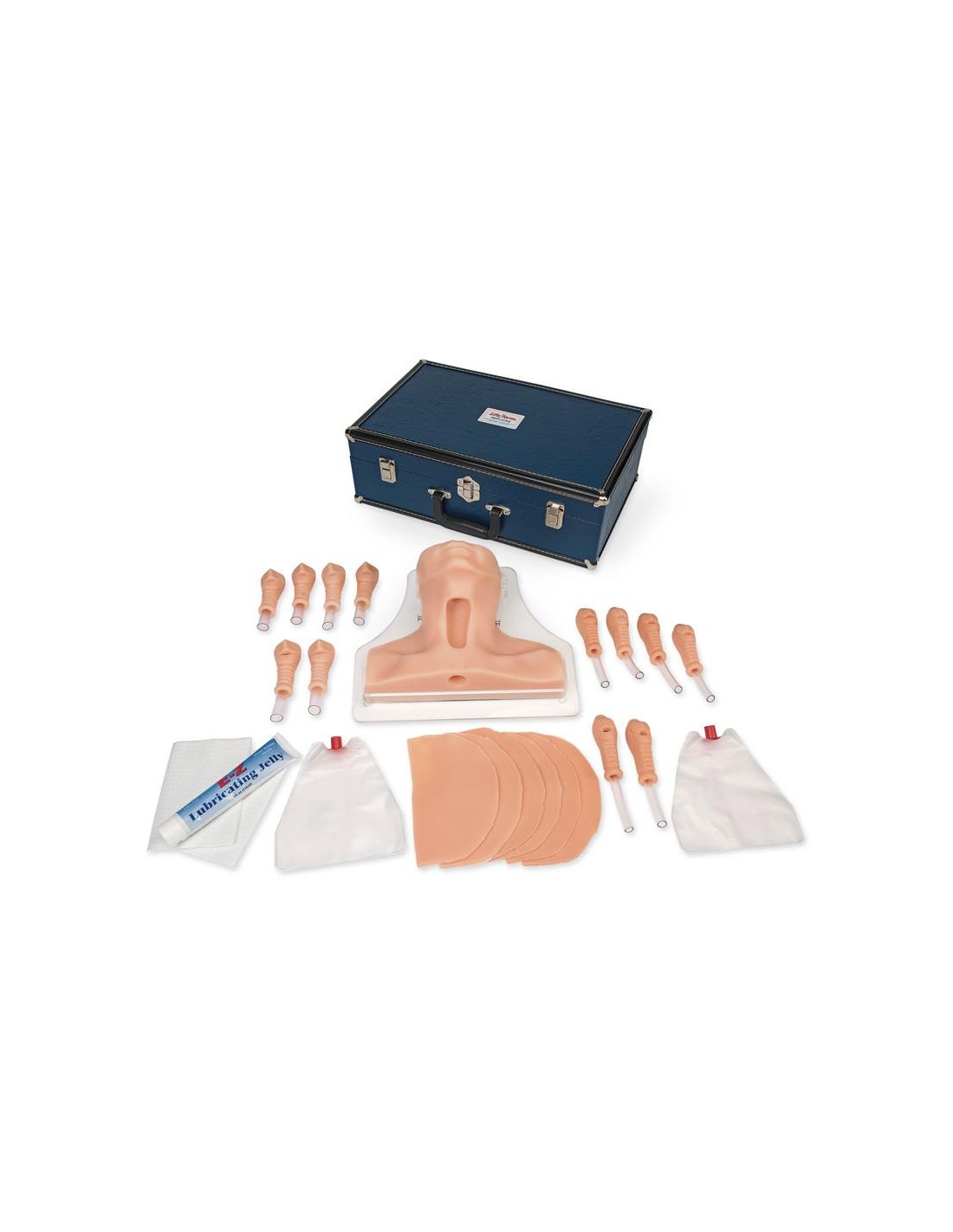 Comprend le simulateur avec son socle, six peaux de cou remplaçables, six inserts de trachée pour adultes (quatre rigides, deux souples),